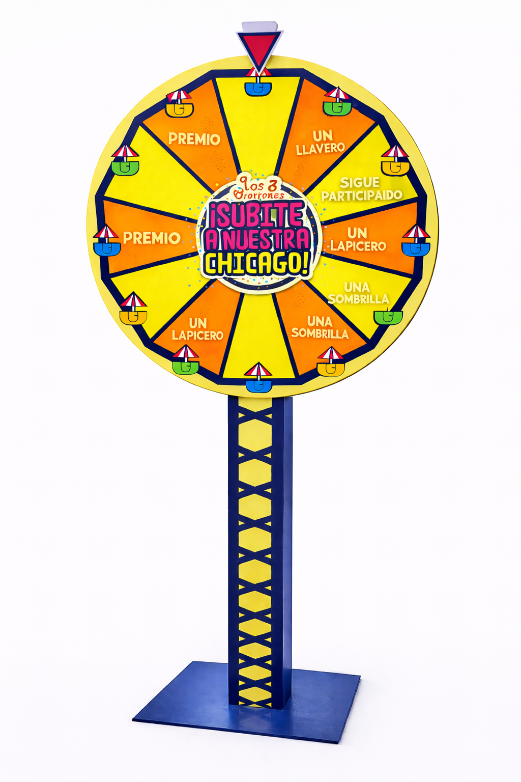 Ruleta personalizada en vinil sobre MDF con acabado de corte láser e incluye base de soporte, ideal para destacar tu marca o dinámica con un toque original y profesional.